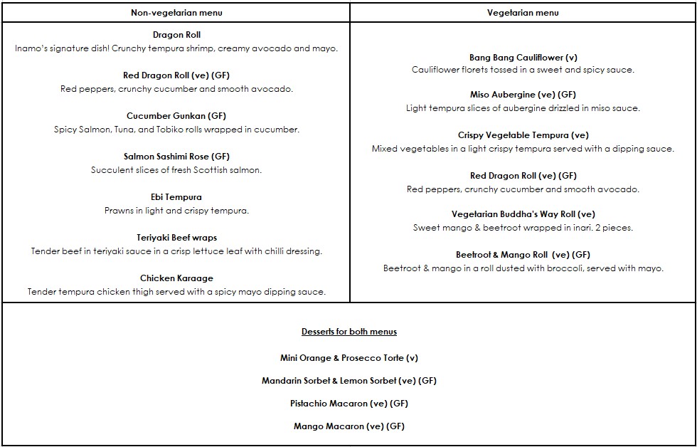 We're delighted to offer a brand new pan-Asian twist on tradition with our Sushi & Asian tapas Afternoon Tea. You can even make it extra special with an hour of bottomless fizz! Tuck into an array of savoury delights, including ebi tempura, beef gyoza mango & papaya salad, plum chicken karaage,and inamo’s signature dragon roll for non-vegetarians and bang bang cauliflower, vegetable onigiri, vegan red dragon roll, and vegetable korokke for vegetarians (see full menu below).Take a look the video below to take a further peek at what you can expect (though please note that some of the dishes have changed)!